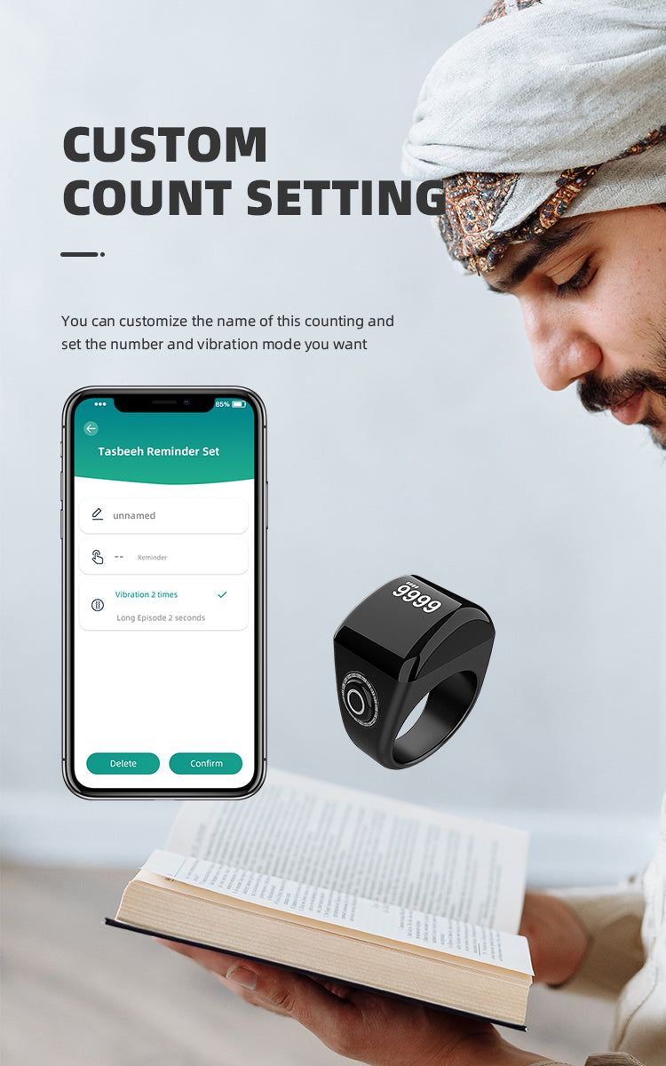 Some models support app connection via Bluetooth to track counts, goals, and prayer times.